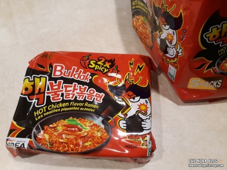 지난번에 셋째가 핵불닭볶음면 (Buldak 2x Spicy) 1개에 월마트에서 파는 일반 라면 1개의 사리만 섞어서 만들었었다. 라면 사리 1개를 추가로 넣었지만 여전히 매웠고 먹을만해서 남편의 요청에 의해 셋째가 또 다른 실험을 해봤다.