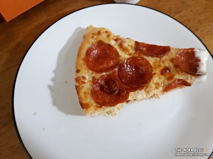 페퍼로니 피자와 치즈 피자 중에서 페퍼로니 피자로 1조각 가져왔다. 맛있다.
