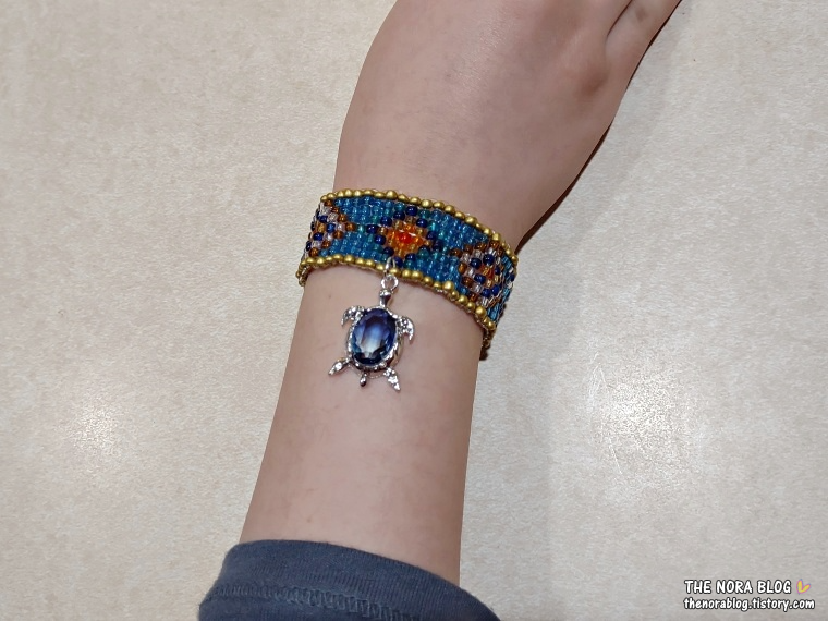 이번 막둥 넷째에게 만들어준 팔찌도 비즈 전용 직조기 없이 작은 구슬들을 하나씩 손으로 꿰어 만든 거다. 집중력과 인내심이 필요한 작업이다. 셋째는 이 팔찌를 만드는 중 잘못된 부분을 발견해서 풀고 다시 만드느라 시간이 좀 걸렸다고 한다.