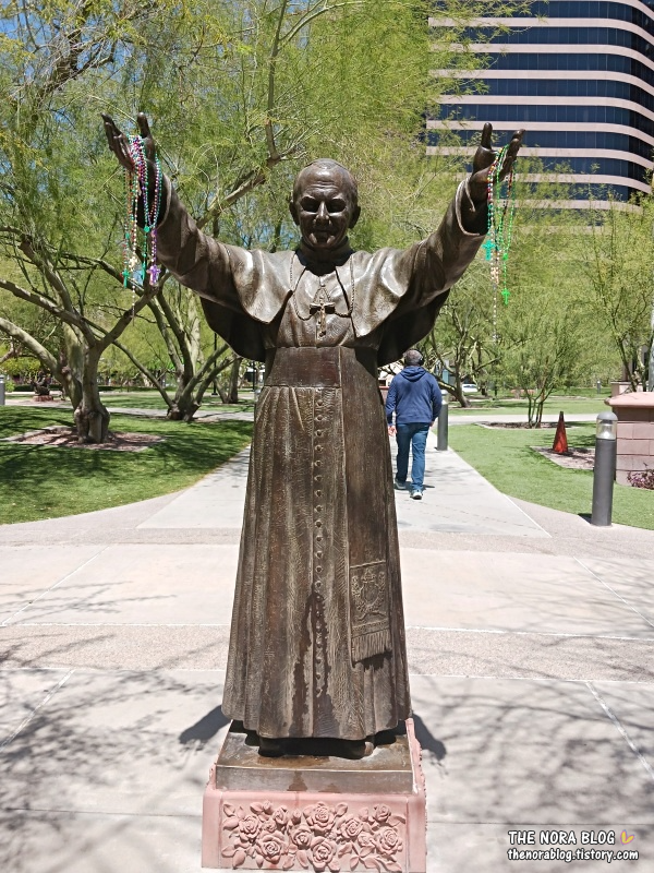 이 성당을 바실리카로 축성해 주신 교황 요한 바오로 2세의 동상도 있다. 전에는 묵주가 동상에 걸려있는 걸 못 봤는데 오늘은 잔뜩 걸려있다. 지난주가 부활절이었으니 그 영향도 있지 않을까 싶은데 확실히는 모른다.