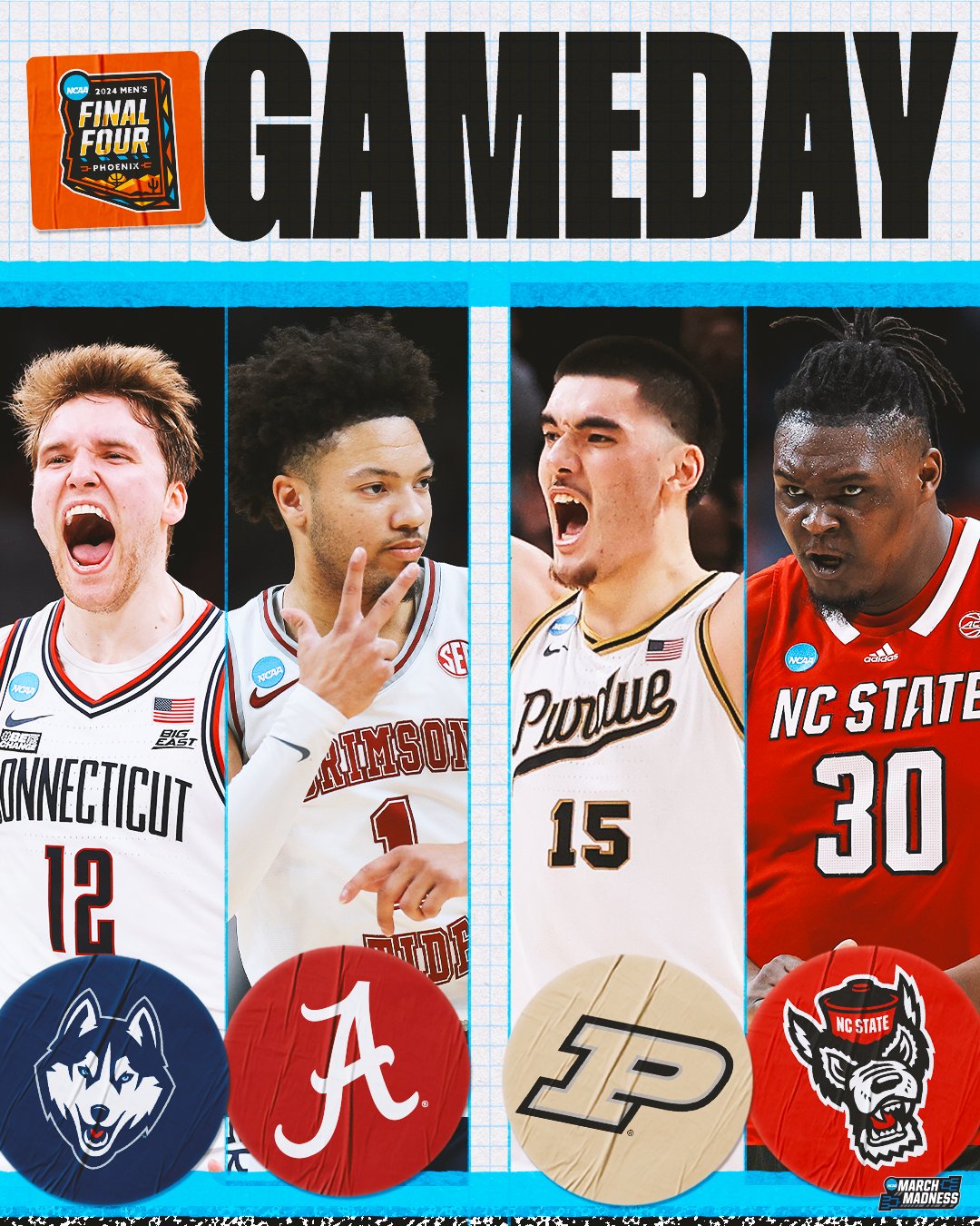 2024 Final Four 경기는 UConn Huskies (코네티컷 대학교) vs. Alabama Crimson Tide (앨라배마 대학교)와 Purdue Boilermakers (퍼듀 대학교) vs. NC State Wolfpack (노스캐롤라이나 주립대)다. 준결승전은 오늘 4월 6일 (토요일)에 개최되고 있다.