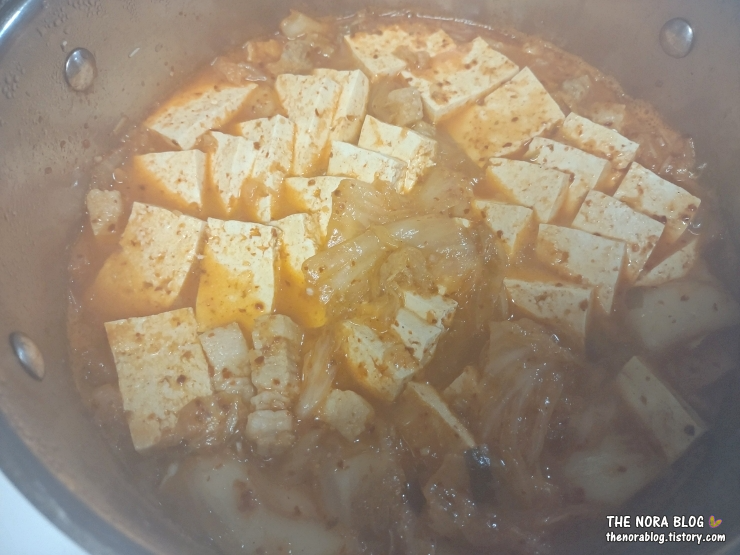 삼겹살 넣고, 김치 한 통 넣고, 두부 한모 넣고, 추가 양념 해서 만든 김치찌개. 한 냄비 가득 보글보글 끓는다.