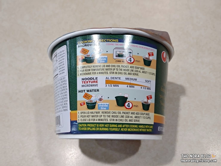 용기 안 점선까지 물을 붓고 4분 기다라고 한다. 일반 사발면은 3분 기다리라고 했던 것 같은데 프리미엄 육개장 사발면은 다르다. 4분이다.