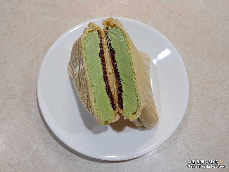 개별포장부터 전에 먹었던 이무라야 말차 아이스크림 샌드위치보다 물고기가 큰 걸 알겠다. 포장도 더 이쁘게 되어 있고 물고기가 확실히 크다. 포장이 더 이뻐서 고급져 보인다.