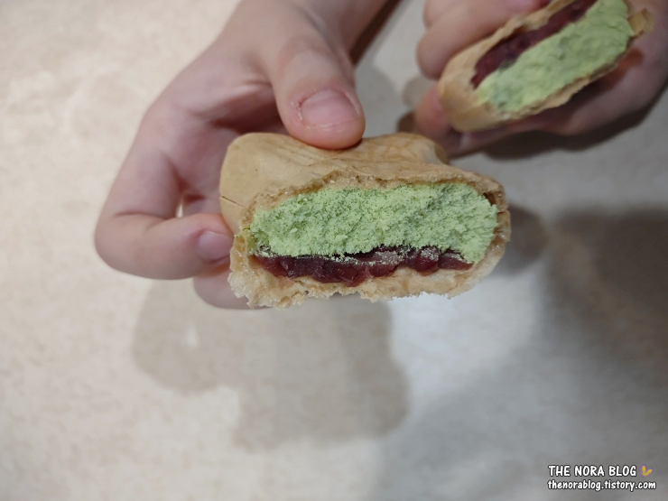 두 달 전에 먹었던 이무라야 말차 아이스크림 샌드위치의 단면은 이렇게 생겼다.