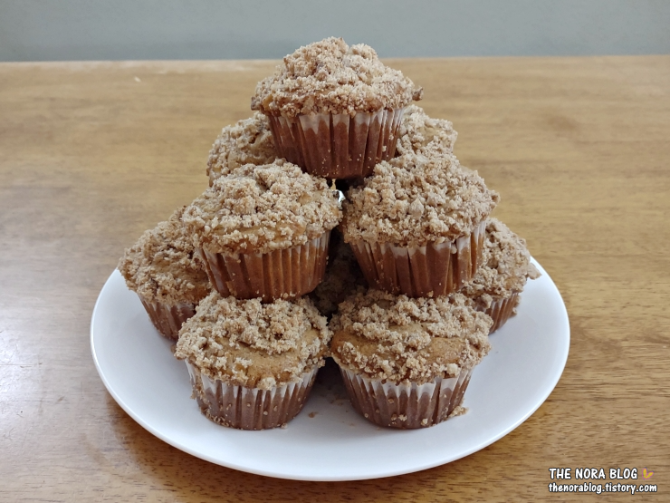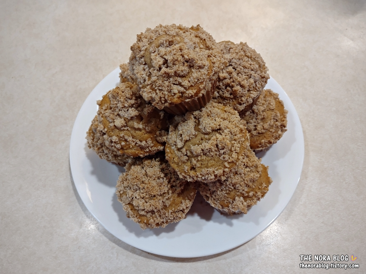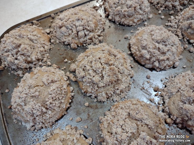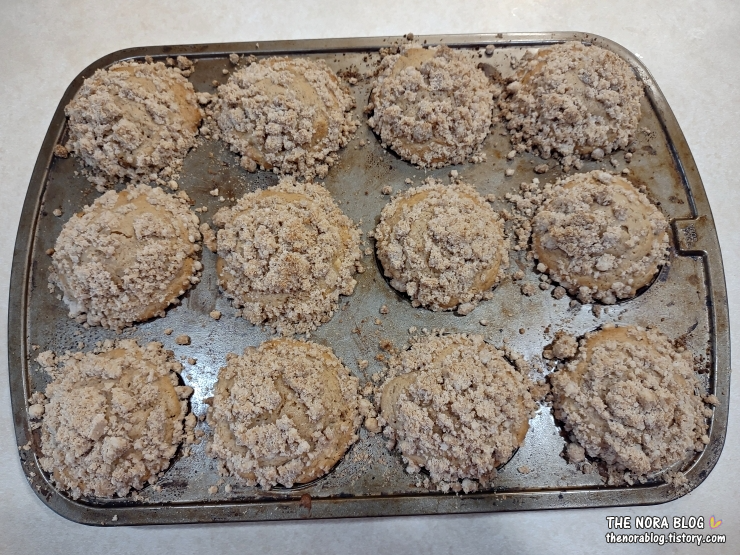 오븐에서 애플 머핀이 나왔다. 집안에 퍼지는 머핀 냄새가 너무 좋다. 머핀 위에 streusel이 덮혀져 있어서 애플 소보로 머핀이다.