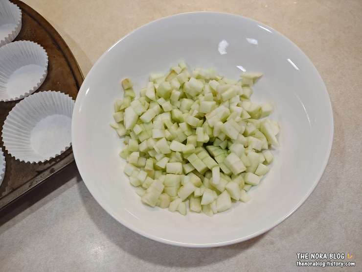 막둥이는 아래층에 내려오자마자 애플 머핀을 만들기 위해서 분주하게 움직인다. 오후에는 추수감사절 저녁식사로 뉴욕 스트립 로스트를 구울 거라사 오븐이 바빠질 예정이다. 뉴욕 스트립 로스트로 오븐을 사용하기 전에 애플 머핀을 오븐에서 구워야 한다.
