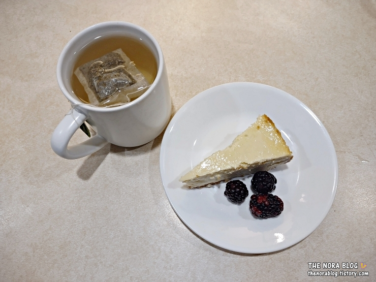 블랙베리 3개와 녹차도 한잔 가져다가 치즈케이크와 함께 먹어 준다.