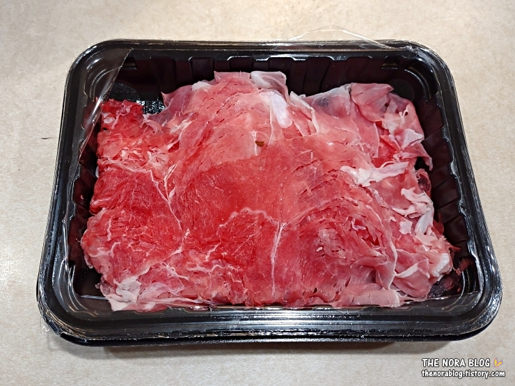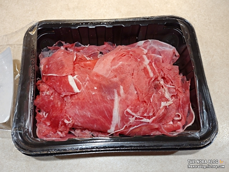 고기는 소고기를 얇게 저며서 파는 걸로 사 왔다. 미국에서는 이렇게 얇게 저민 고기를 필리 치즈스테이크, 케사디야, 타코 등을 만들 때 많이들 사용하다. 샤브샤브도 고기가 얇은 게 좋으니까 이걸 사용하면 된다.