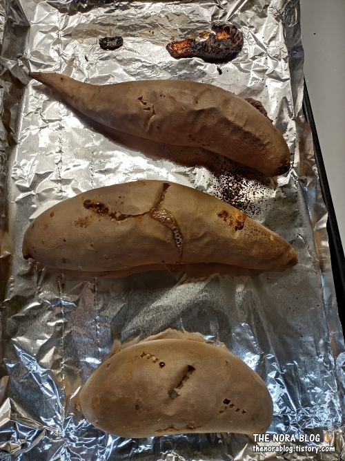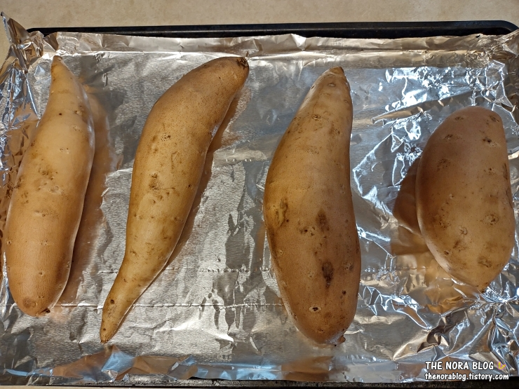 고구마가 커서 화씨 425도 (섭씨 220도) 예열한 오븐에서 50분 굽고 오븐에 있는 상태로 불 끄고 5분 동안 그냥 뒀다. 한국 고구마와 비교해 미국 고구마는 크기가 전반적으로 꽤 큰 편이다.