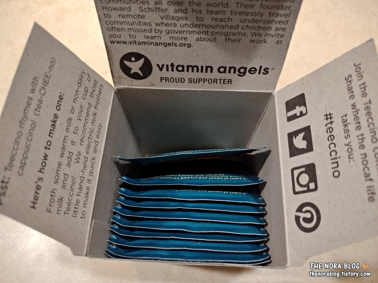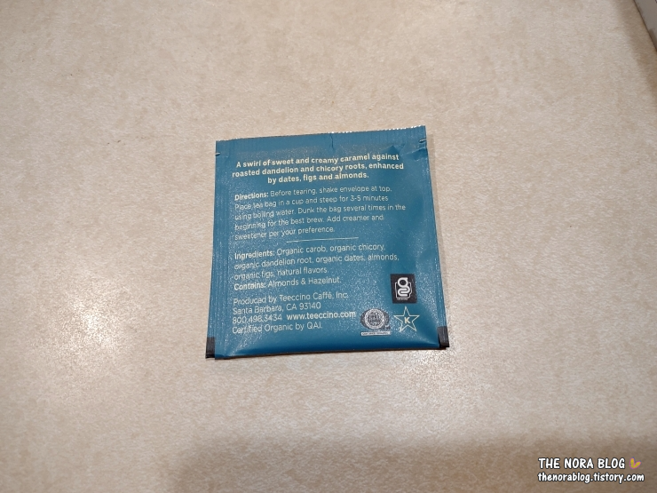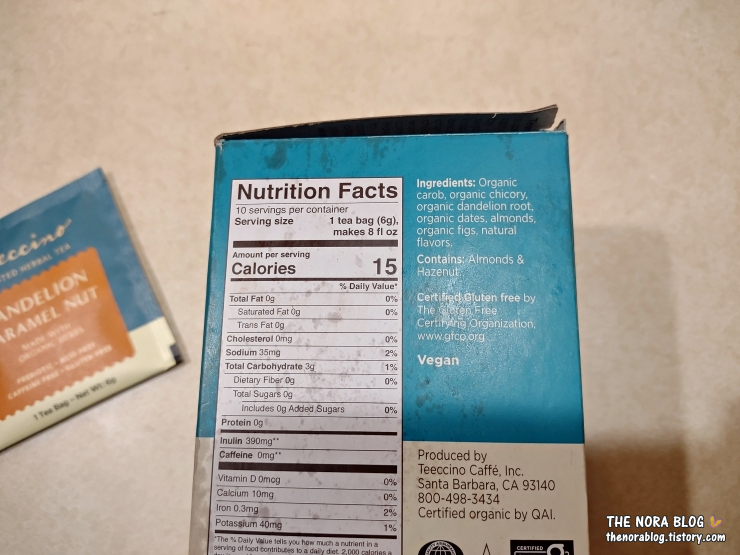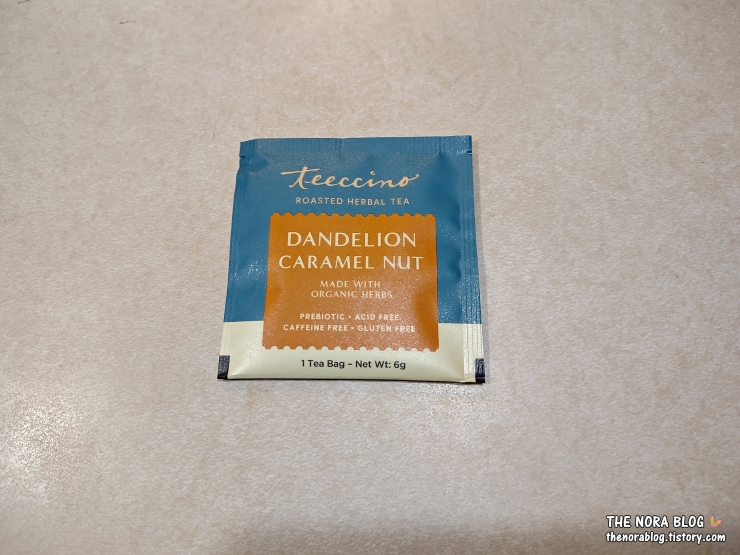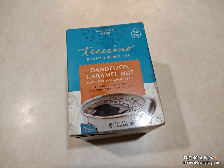 제품명은 Teeccino Dandelion Caramel Nut Tea로 민들레 허브티다. 한 포장엔 10개의 티백이 들어있다.