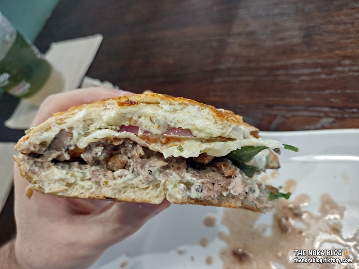 남편이 먹는 걸 한 입 맛을 봤다. 잘 녹은 프로볼로네 치즈가 넉넉하게 들어간 스테이크와 조화가 잘 맞아서 꽤 맛있다. 그리고 스파이시라는 말답게 매콤하다.