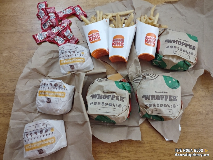 집에 돌아와 와퍼부터 시작해 본다. 각각 3개씩이라서 남편, 막둥 넷째, 나 이렇게 하나씩 나눠 먹으면 되지만 내가 와퍼 하나를 다 먹긴 양이 많다. 치즈버거도 보여주고 싶으니까 와퍼는 1/4만 먹고 남편에게 넘겼다.