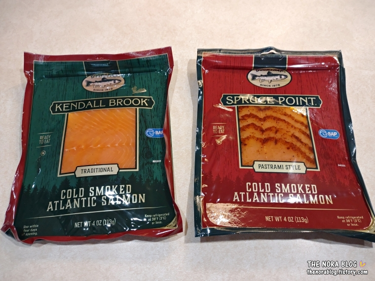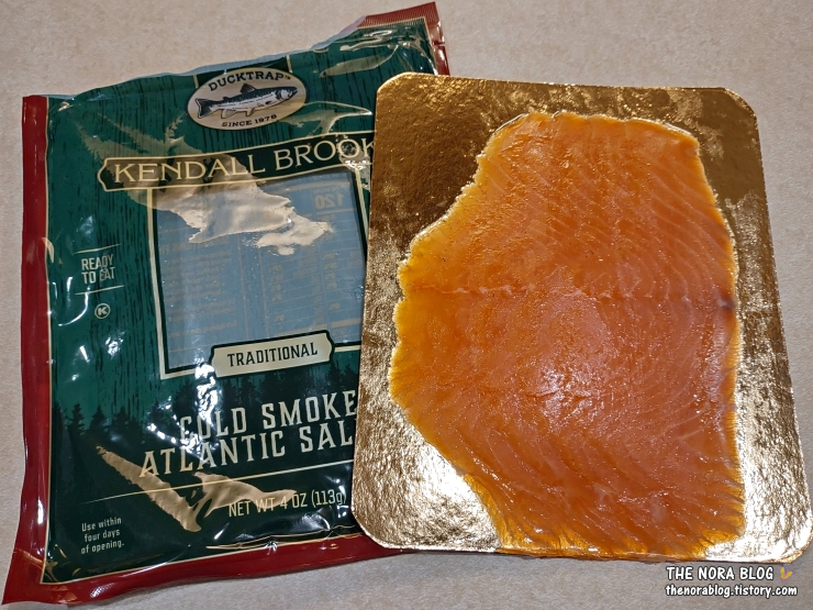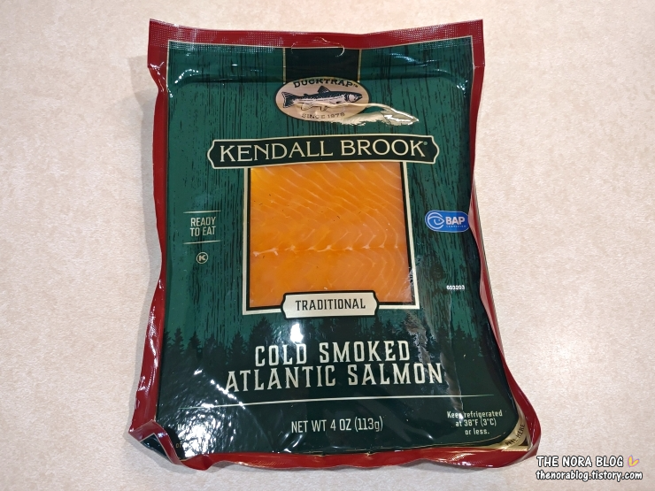 다음날 두 번째 훈제 연어 포장을 열었다. Kendall Brook Traditional Cold Smoked Atlantic Salmon (이하 Kendall Brook Traditional)의 중량도 4 oz (113g)으로 가격은 $6.99 (10,000원)다.