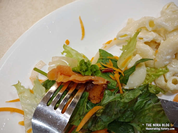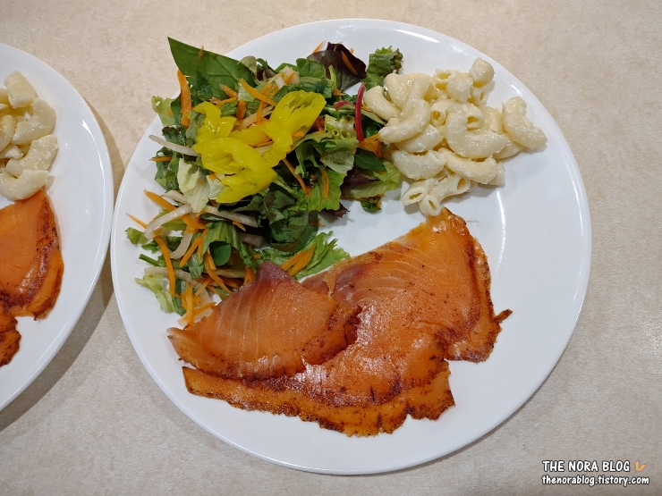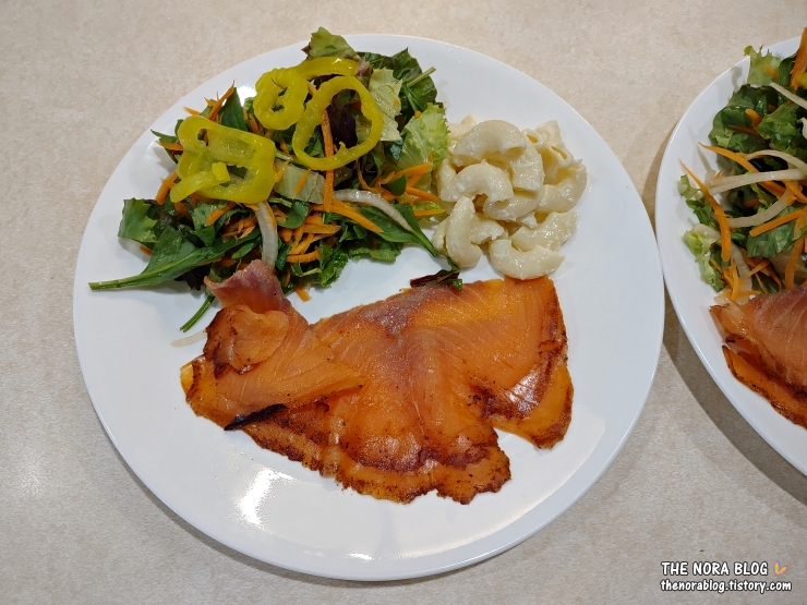 연어가 기름진 생선이라서 이렇게 샐러드와 마카로니 샐러드 또는 매쉬드 포테이토 같은 것과 함께 하면 포만감이 꽉 차오른다. 금방 배불러지고 또 좋은 지방이 많은 생선이라 다이어트하는 사람들에게 좋을 것 같다.