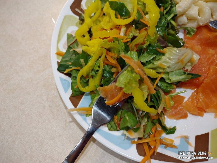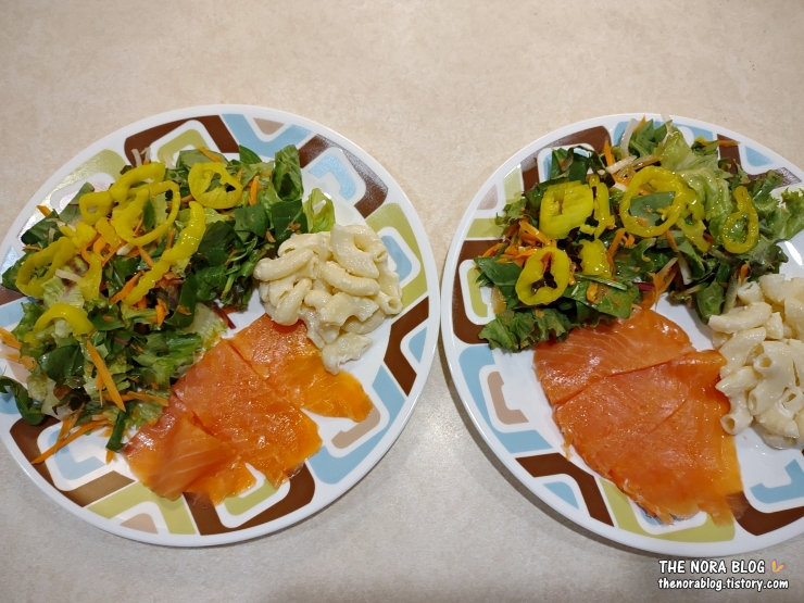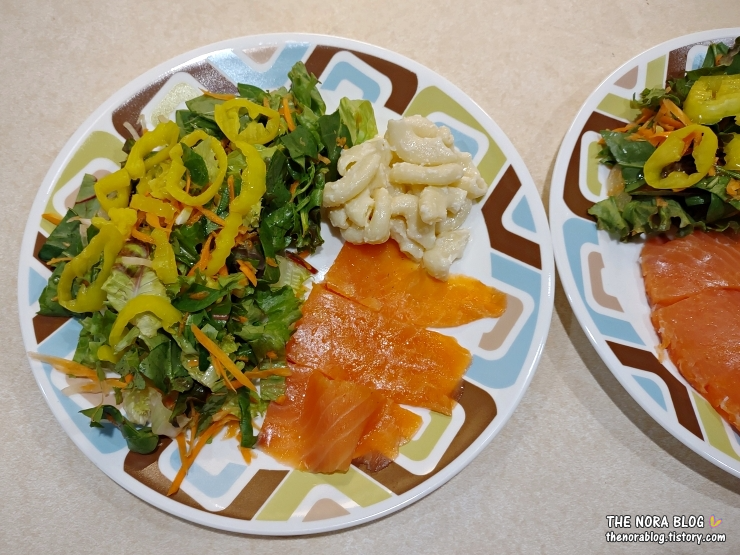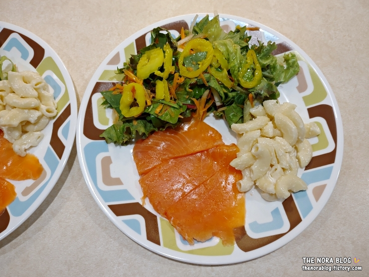 샐러드용으로 준비해 둔 채소와 마카로니 샐러드가 있어서 함께 먹어봤다. 막둥 넷째는 연어를 안 좋아한다고 먹기 싫다고 한다. 남편과 나만 둘이 나눠먹었다.
