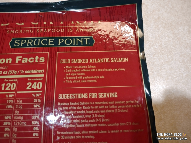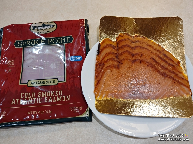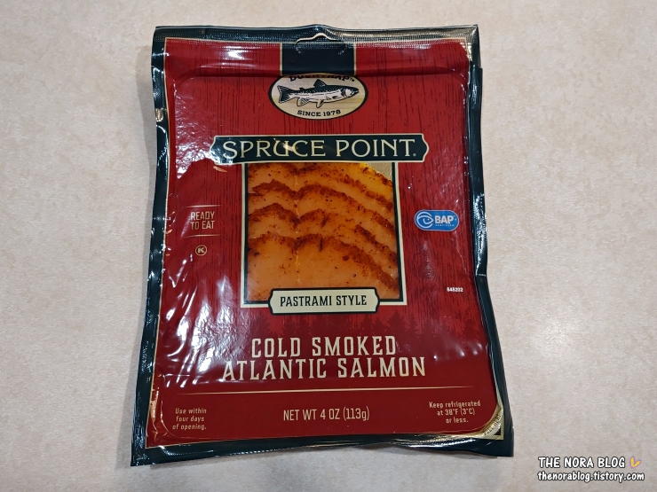 Spruce Point Pastrami Style Cold Smoked Atlantic Salmon (이하 Spruce Point Pastrami Style)의 중량은 4 oz (113g)으로 가격은 $7.19 (10,100원)이다. 파스트라미 양념을 한 훈제 연어다. 도톰하게 썰어져 있다.