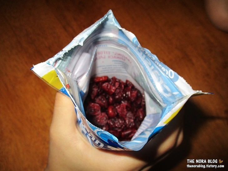겉보기에 내용물은 일반 건크랜베리와 다를바 없습니다. 하지만 석류 쥬스에 크랜베리를 우려냈다니 맛이 뭔가 다르겠죠. 처음 입에 넣었을 때는 그냥 건크랜베리 맛이였어요. 그런데 두번째 입에 넣자 그때부터는 "와~ 이거 맛있네!" 이렇게 변해요. 그러고는 자꾸자꾸 손이 갑니다. 석류 쥬스의 맛이 뒷맛으로 잔잔하게 남는데 이게 건크랜베리 맛을 더 좋게 만들어요. 이거 옆에 두면 한봉지 금방 다 먹겠어요.