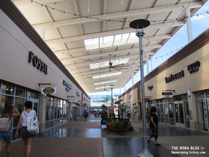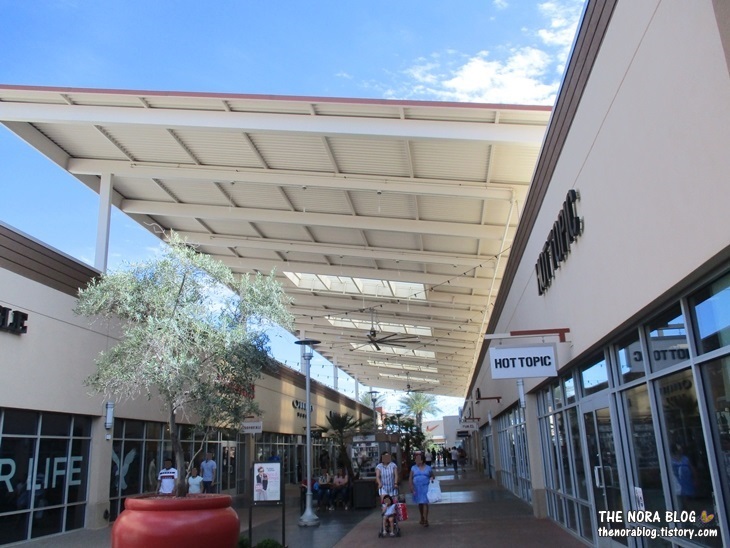 아웃렛 상점 사이로 난 골목 위에는 가림막으로 이렇게 그늘지게 되어 있어요. 선풍기도 위에서 돌면서 바람을 솔솔 불어 주구요. 사막인 이곳에서 가림막은 비를 막는다기 보다 햇볕을 막는 기능이 더 강해요. 그늘진 곳과 햇볕이 그냥 내려쬐는 곳의 온도차는 상당합니다. 특히 한여름에는 그 차이가 더 심할 거예요.