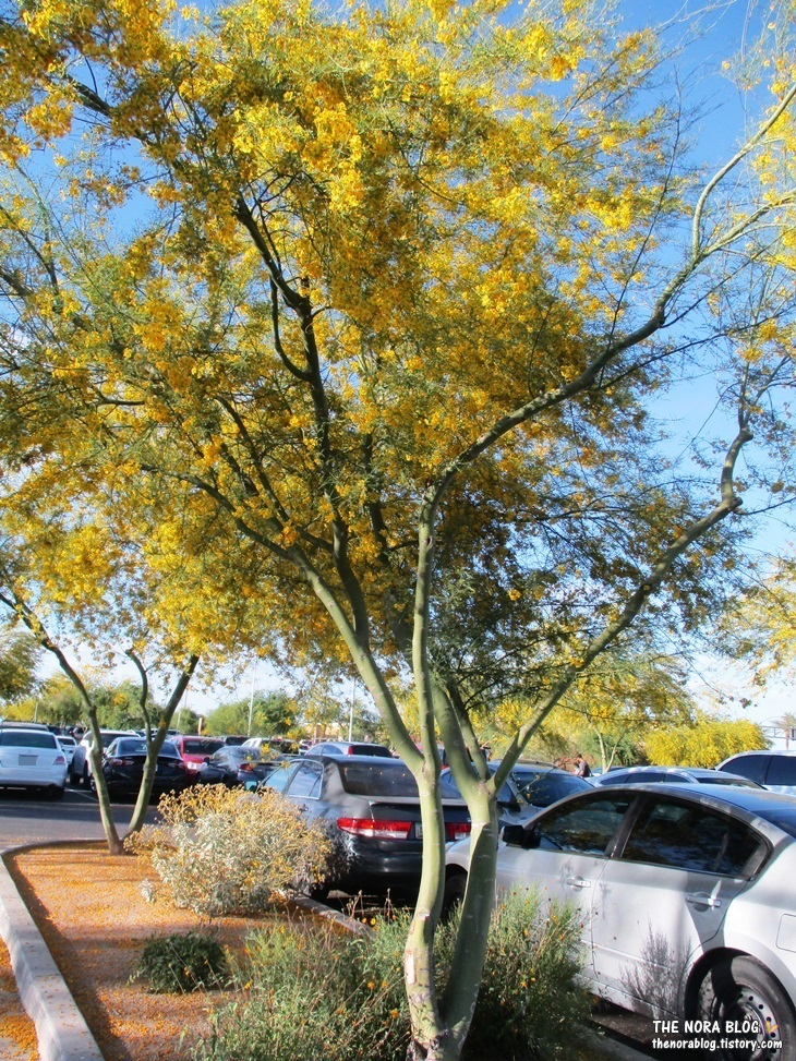 주차장으로 돌아왔는데 팔로 버디(palo verde)의 노란꽃이 흐드러지게 피어 있습니다. 팔로 버디는 울동네 소노라 사막이 원산지인 나무인데 봄에 이렇게 화사하게 꽃을 피웁니다. 나무 몸통은 흔한 밤색이 아니라 이렇게 녹색이에요. 그래서 이름도 녹색 막대기란 뜻의 스페인어 palo verde입니다. 영어화 된 단어라 영어로 읽어서 발음은 팔로 버디 비슷하게 되구요.