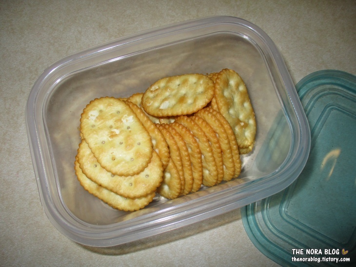 패밀리 사이즈에는 오리지널 크래커가 6 줄 들어 있습니다. 크래커를 한 줄 꺼내면 이렇게 통에 넣고 식구들이 조금씩 생각날 때 가져다 먹어요.