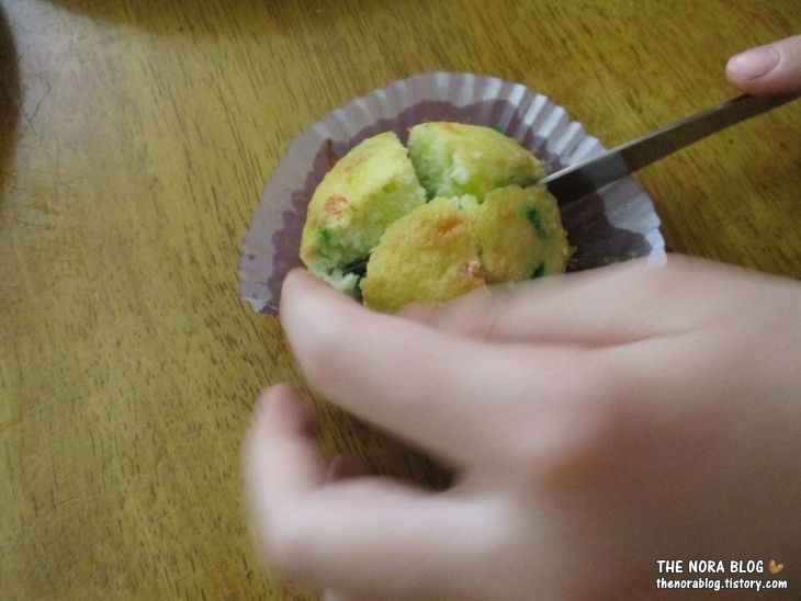 아이들은 12배 수로 컵케이크 숫자를 맞추고 싶대요. 그래서 남는 2개를 맛보기로 먹어 봤어요. 컵케이크 하나를 가져와 셋째와 함께 나눠 먹었습니다. 셋째가 먹기 좋게 잘라주네요.