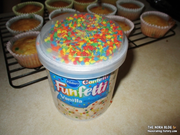 울집 아이들이 컵케이크를 만들 때는 보통 시제품을 전혀 쓰지 않아요. 모두 자기들 비법에 따라 재료부터 직접 맞춰 만들어 굽죠. 아이들이 숙모 덕에 이번에 필즈베리 케이크 믹스를 써 구워봤는데 이것도 재밌나 봐요. 가끔 시제품을 써보면 케이크 만들기에 또 배우는 것도 있고요. 얘들 숙모는 색이 고운 스프링클이 함께 들은 프로스팅인 Confetti Funfetti Vanilla Flavored Frosting(컨페티 펀페티 바닐라 맛 프로스팅)도 함께 보내줬어요. 아이들이 컵케이크 데코레이션은 내일 하겠다고 합니다. (기대하고 있음)