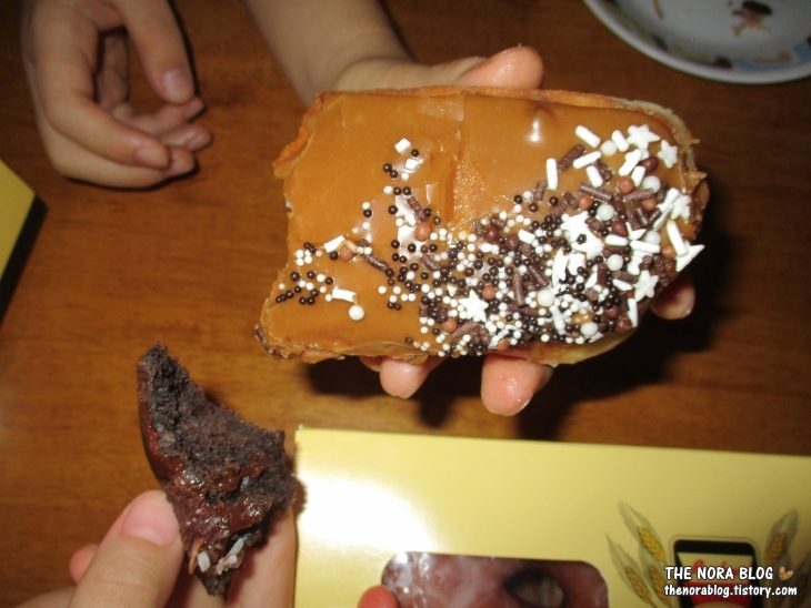 남편은 삼각형으로 만들어 안에 애플 필링을 넣은 도넛으로 가져가 먹더군요. 애리놀다도 좋아하는 도넛인데 이번엔 apple fritter (애플 프리터)가 먹고 싶어서 그걸로 가져왔어요. 애플 프리터는 흔히 곰발바닥이라고 부르는 도넛입니다. 애플 프리터를 원래 좋아하기도 하지만 이걸 선택한 가장 큰 이유는... 도넛 하나 크기가 커요. 헤헤. 녹차와 함께 먹습니다.