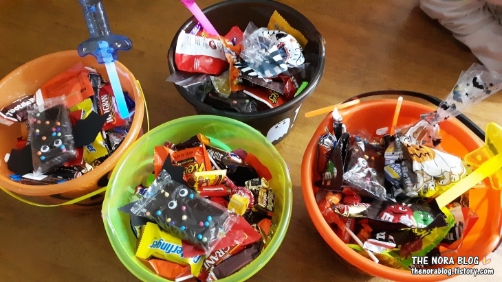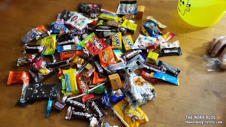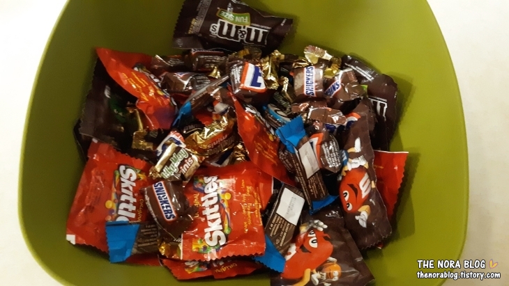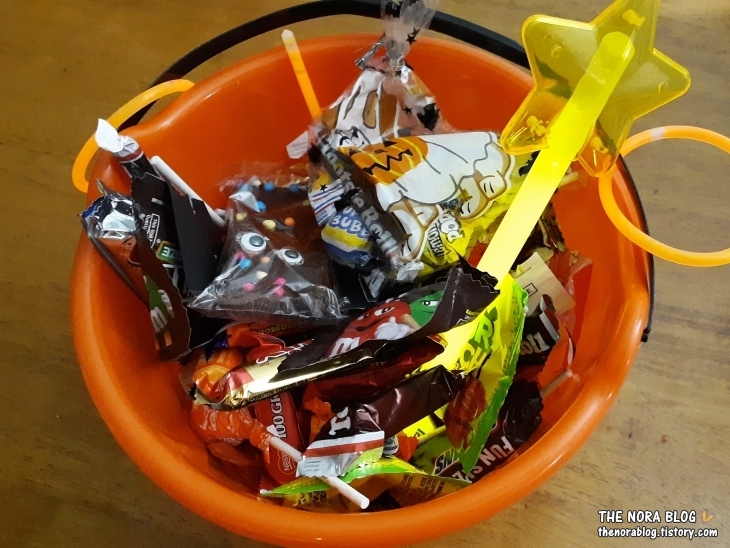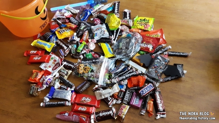올해 할로윈에도 울 아이들의 사탕 수확량은 예년처럼 아주 좋습니다. 그런데 올해는 더 좋은 사탕 풍년이에요. 첫째와 공통적으로 느낀 바로는 올해는 사탕타러 나온 아이들 수도 줄었고, 사탕을 주는 집들도 전체적으로 줄었어요. 그런데 사탕 주는 집들에서 주는 사탕 양은 더 많았답니다. 한 움큼씩 듬뿍. 그렇게 주시더라고요.