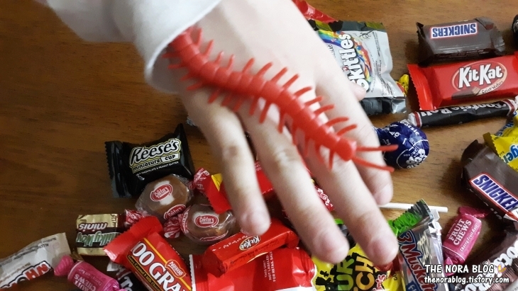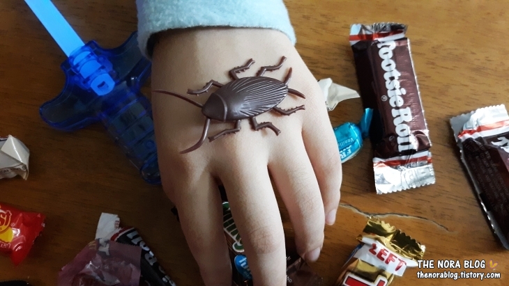 어쨌든 이 엄마가 함께 사탕타러 나가 도움을 주었으니 아이들 넷에게서 하나씩 징수했습니다. 원래는 셋째가 그냥 엄마한테 하나 주고 싶다고 가지고 왔는데 이에 감흥한 이 엄마가 다른 아이들에게서도 받아 온 거예요. 일종의 서비스 비인 셈이죠. (애리놀다의 경제관념 교육. 하하하)