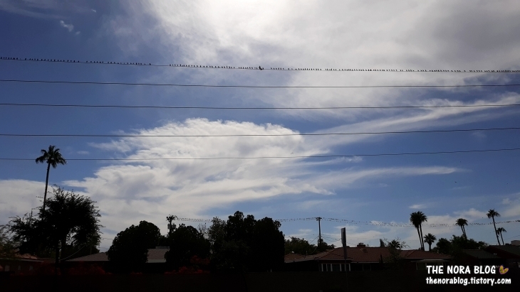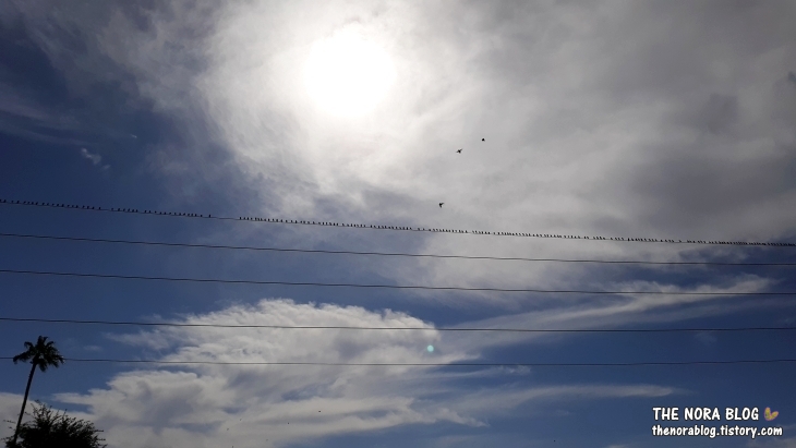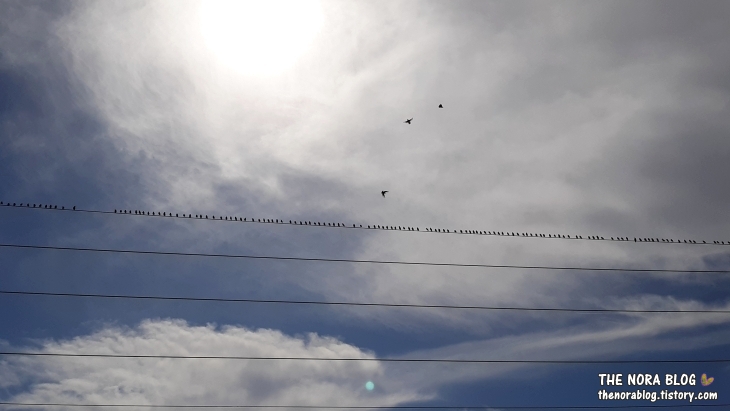 전선줄에는 새들이 빡빡하게 자리 잡고 있어요. 전선줄이 몇 개가 있는데도 어디 꿀발라 놨나 이상하게도 한 전선줄에만 올인입니다. 쟤들도 날이 좋으니까 평온하게 자리 잡고 앉아 오가는 사람들과 차들을 구경하고 있나 봐요.