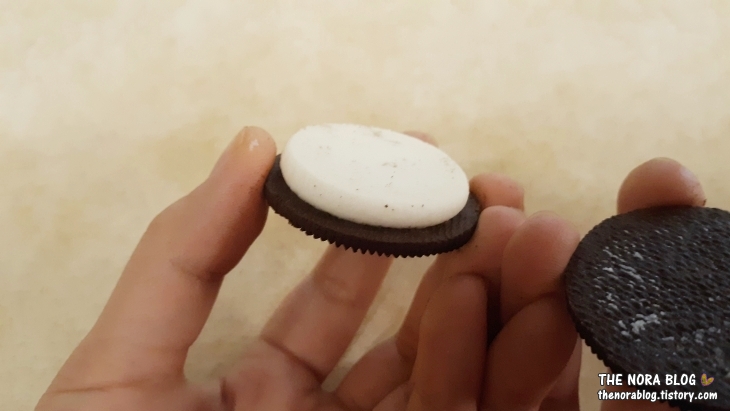 얇은 쿠키라서 대부분 하얀 크림 샌드는 거의 보이지 않습니다. 크림 샌드가 적다 보니까 쿠키 부분의 맛이 강해서 코코아의 씁쓸한 맛이 다른 오레오 쿠키보다 두드러집니다. 이런 코코아의 살짝 씁쓸한 맛을 좋아해서 이점은 맘에 들었어요.