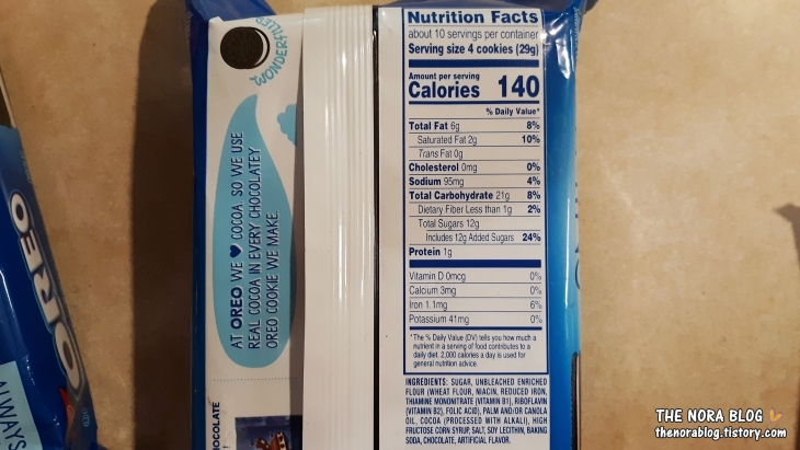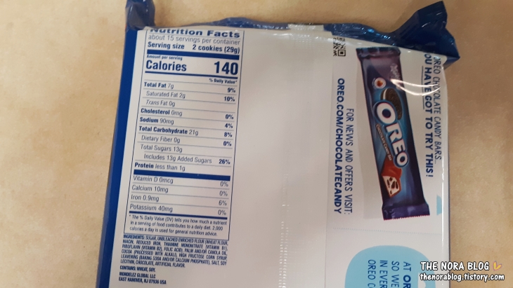 홀쭉이 오레오 씬즈는 쿠키도 얇고 안에 크림도 얇게 끼여 있어요. 아마도 오레오 쿠키는 너무 먹고 싶은데 칼로리가 걱정되는 사람들을 위해서 만든 게 아닌가 싶어요. 얇은 홀쭉이 오레오 쿠키이니만큼 열량도 상대적으로 낮아서 4개에 140 칼로리입니다.