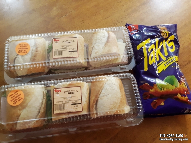 마켓에서 장 보다가 간단하게 먹을 음식도 함께 사 왔어요. 간단하게 먹을 음식은 1 풋(30cm) 샌드위치 2개, 매운 멕시코 과자 Takis Fuego(타키스 푸에고), 페퍼로니 피자 한 판입니다.