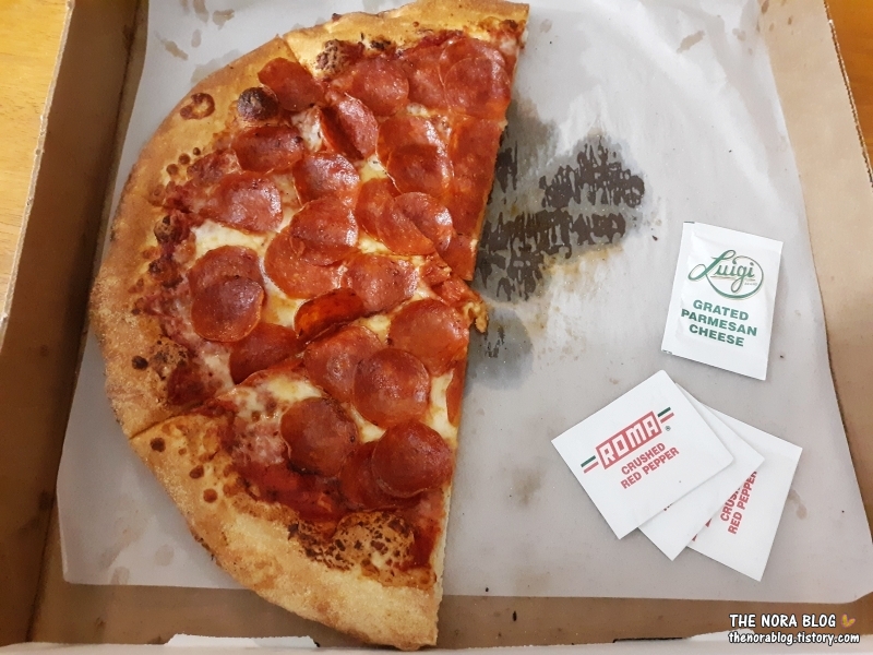 Original Geno's Pizza는 크러스트가 얇아느 편이에요. 두꺼운 크러스트는 너무 빵 같아서 좋아하지 않는데 맘에 듭니다. 페퍼로니도 인심 좋게 덮어줘서 그것도 좋고요.