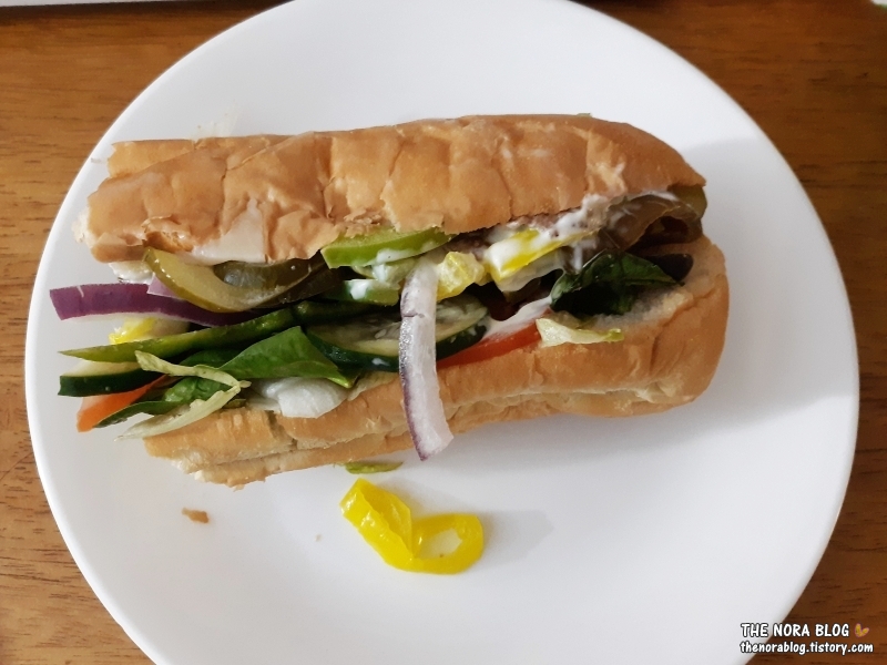 집으로 돌아와 먼저 써브웨이에서 사온 steak & cheese sandwich(스테이크 & 치즈 샌드위치)를 6 식구가 각자 6 인치(15cm)씩 깔끔하게 먹어 줍니다. 스테이크 & 치즈 샌드위치에는 고기도 기분 좋게 들어 있었고 채소도 듬뿍. 맛있었습니다.