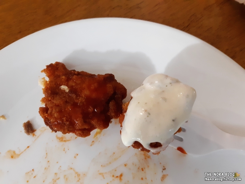 그런데 핫소스가 너무 짜요. 나중에 주문하면 매운맛이 아닌 일반 맛으로 해야겠어요. 그리고 이름은 닭날개인데 실제 살은 닭가슴살인 듯합니다. 하지만 퍽퍽하지 않고 괜찮았어요.