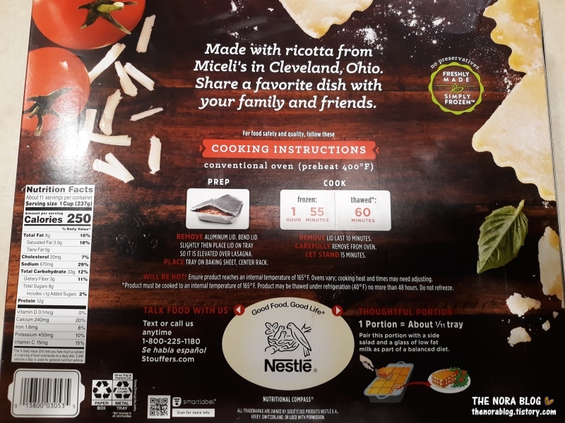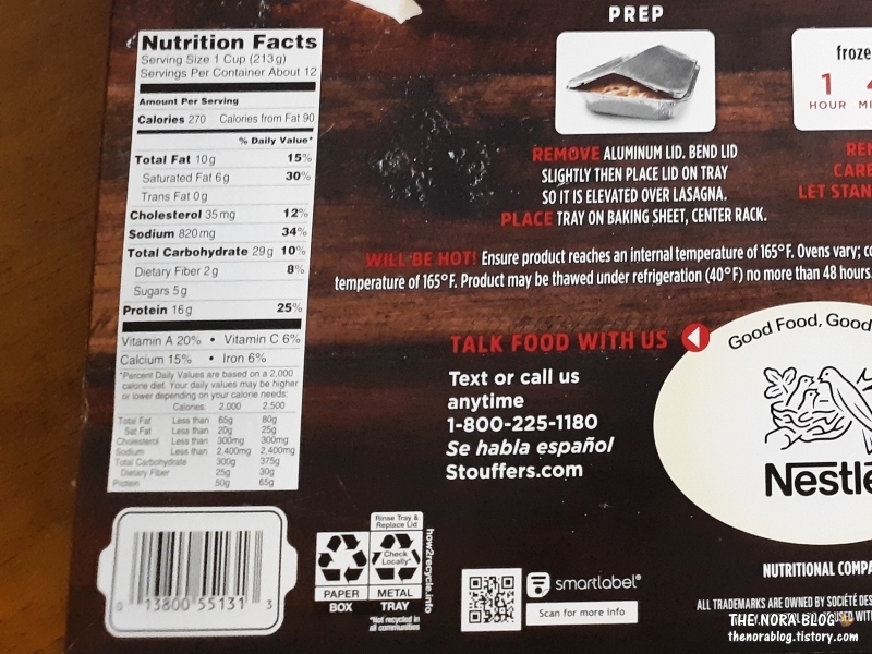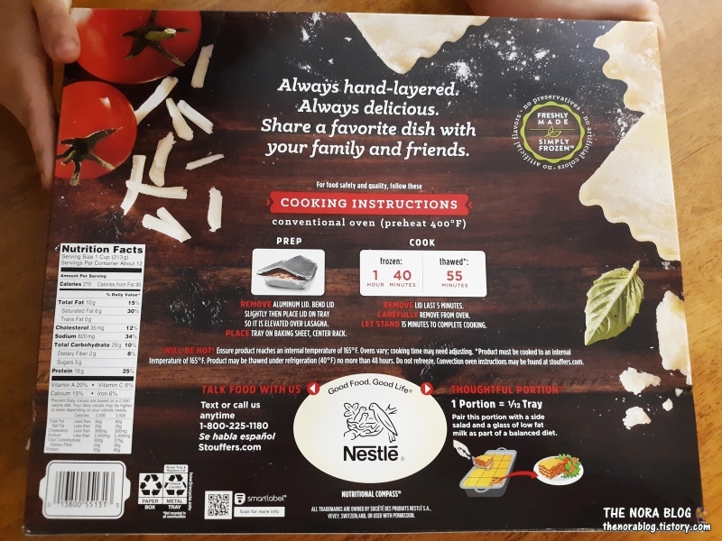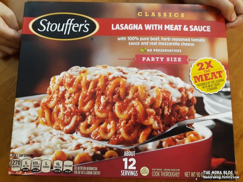 미국에서 냉동 라자냐는 개인적으로 Stouffer's(스토퍼즈) 것이 맛있어요. 스토퍼즈 냉동 라자냐 중에서는 Lasagna with Meat & Sauce(미트 & 소스가 있는 라자냐)가 제일 맛있고요. 라자냐 미트 & 소스로 2개 사서 두번 먹었습니다.