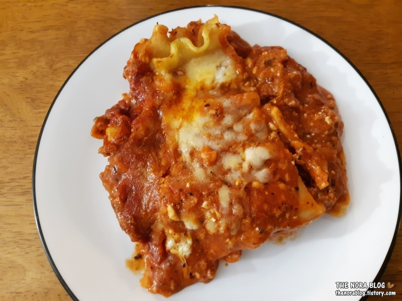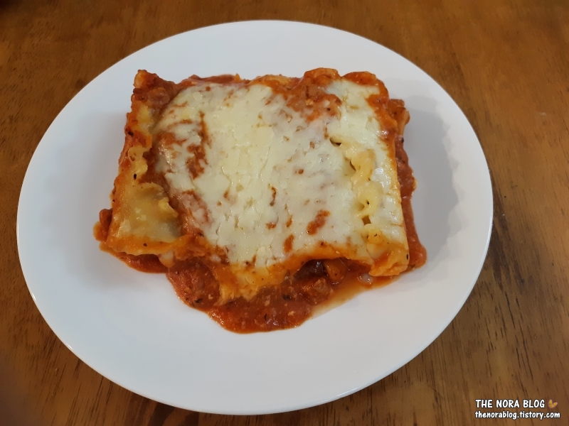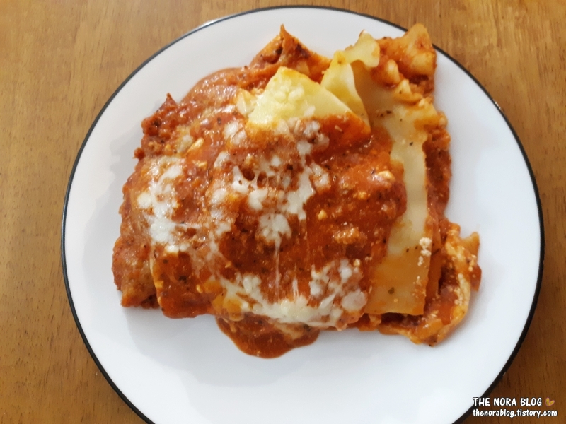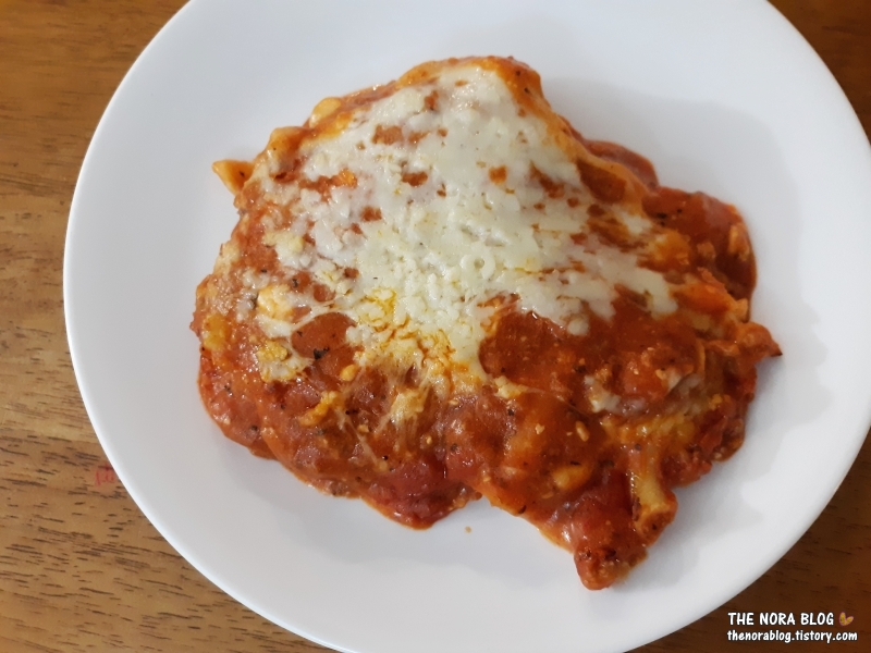 조리법은 포장 뒷면에서 하라는 대로 따라만 해면 됩니다. 오븐에서 데우는 거라 시간만 맞추면 아주 쉬워요. 요즘은 첫째와 둘째가 주로 라자냐를 오븐에서 데워 저녁을 준비합니다. 이 엄마가 아주 편해졌어요.