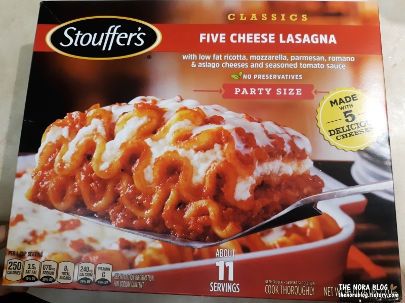 아이들이 라자냐가 맛있다고 해서 장 볼 때 찾아봤는데 미트 & 소스는 다 나갔어요. 그래서 Stouffer's Five Cheese Lasagna(스토퍼즈 파이브 치즈 라자냐)로 사 왔습니다.
